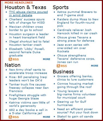 Two, for the pages to be designed in a way that allows you to find what you’re looking for. I have always thought the CNN page was far too busy- and so I don’t visit it much. At least the USA Today page looks something like a newspaper, which allows readers to navigate it something like a newspaper. Google News has the most usable design precisely because it has the least amount of bling. Techmeme rules the tech-related blogosphere for the same reason. Tailrank, which for a while was on the verge of bling-overload, seems to be moving back the other way, which is a good thing. Digg has a relatively simple and easy to navigate interface.
