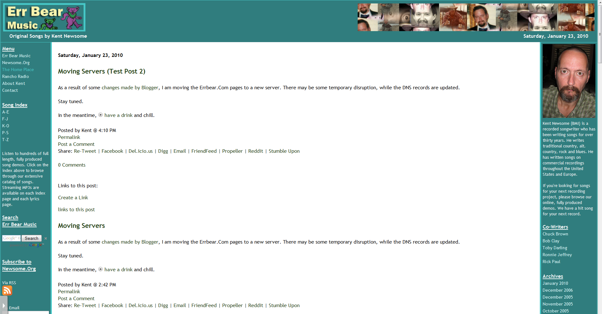 When I was publishing to Errbear Music via FTP, I was hosting the blog files in a directory on my Newsome.Org server, and using a page in that directory (errbear.html) as the blog’s front page. I then parked the errbear.com domain on that page, meaning that when someone directed their browser to errbear.com, he or she was forwarded to the errbear.html page. It looked reasonably seamless. The problem became that all of the post pages and other ancillary pages were located at Newsome.Org, and had a Newsome.Org URL. Once I set up my Custom Domain, I wanted to have all of the post pages and ancillary pages located within that domain. This happened automatically for the post pages, but could not happen automatically for the various ancillary pages located in that directory. The majority of those ancillary pages were the very important lyrics and streaming mp3 pages for my songs. This required me to create a new post page, containing the lyrics and a streaming mp3, for each of my songs. It wasn’t a soul-crushing task, using Live Writer and the time saving Text Template plugin, but it did take some time.