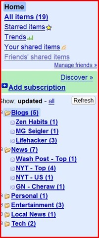 Wikipedia defines a feed reader as follows: “A feed aggregator, also known as a feed reader, news reader or simply aggregator, is client software or a Web application which aggregates syndicated web content such as news headlines, blogs, podcasts, and vlogs in a single location for easy viewing.”  In other words, you can take all that content that you run all over the place trying to find and read, and you can put it in one centralized place.  It puts you, not the various website developers and their advertisers, in charge of how you consume online information.  For those (and you know who you are) who continue to claim that the internet is a dangerous and scary place- Google Reader is perfect for you.  You get the content you’re after right from Google.  And while Google is certainly trying to corner the market on data storage and online advertising, it’s certainly not going to rob you or give you a computer virus.  As an aside, most of the people I know who are scared of the internet already have computer viruses because they are too afraid to find and update an anti-virus program, yet not afraid to open love emails and other obviously bogus missives from people they don’t know.