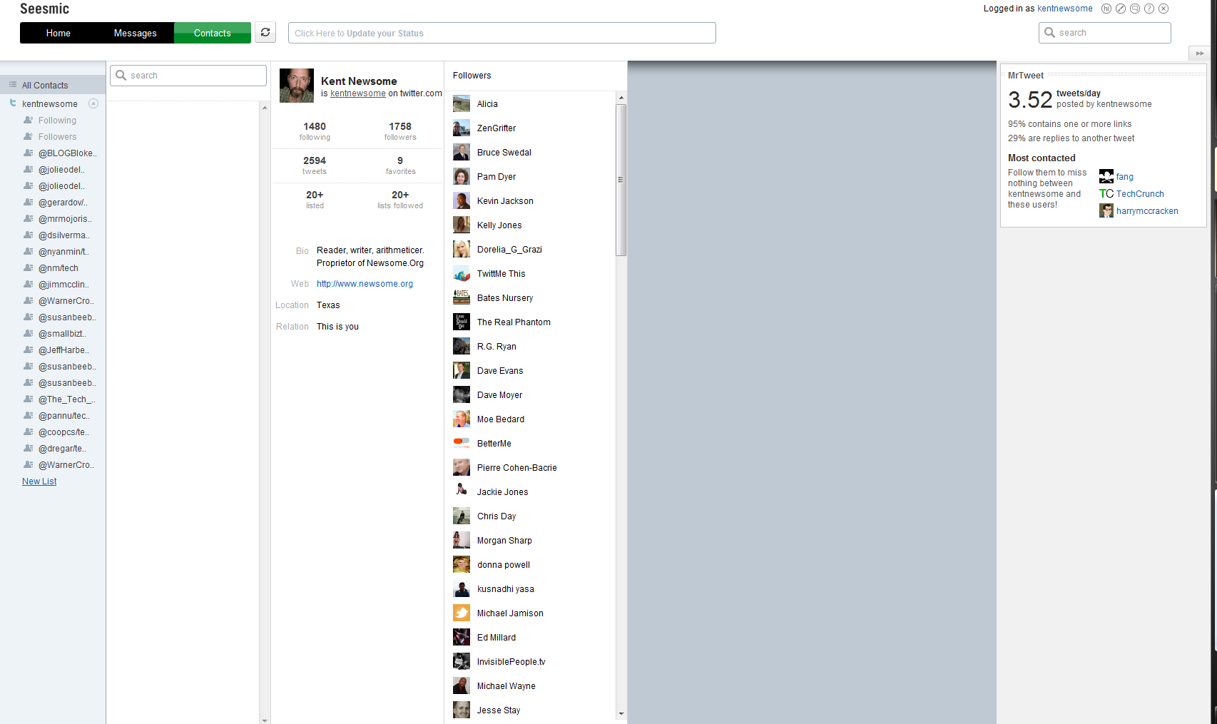 Even with Topify, it’s inexplicably difficult to manage your Twitter follows and followers. There’s no way to mass unfollow people, for example. There are some services that try (or used to try) to provide this sort of thing (Your Twitter Karma, for example), but Twitter doesn’t like them, and has taken the position that some of them violate Twitter’s terms of service.